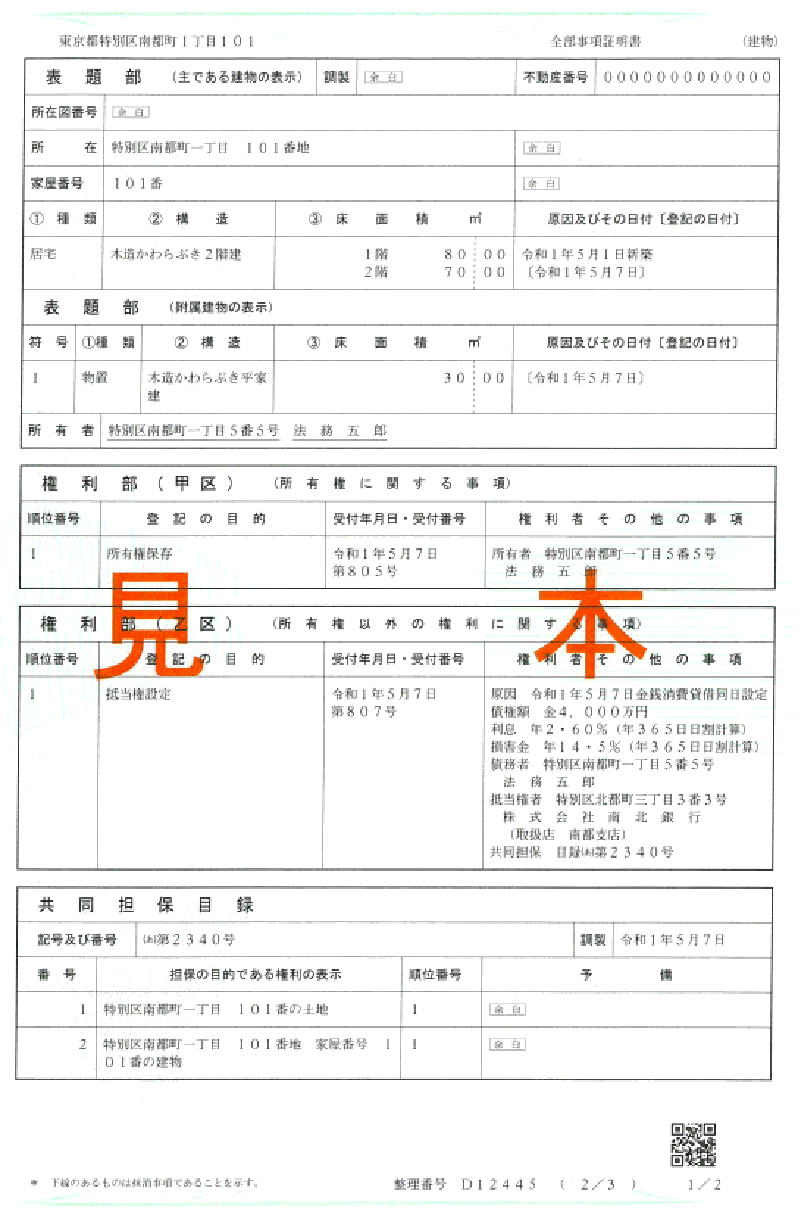 以下は、法務省が公開する建物の登記事項証明書の見本です。
