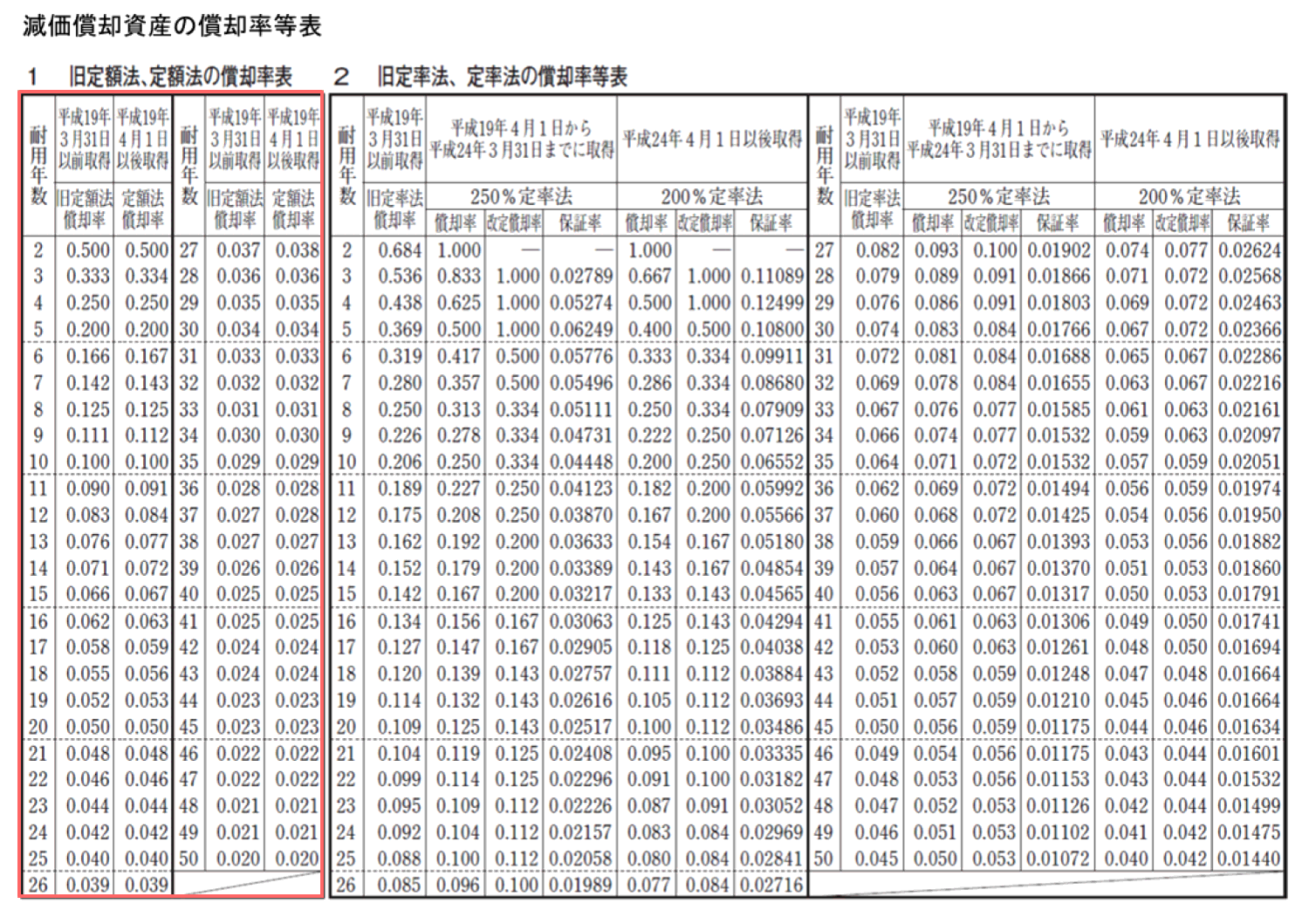 表の見方が難解ですが、赤い線で囲まれた箇所に「旧定額法償却率」と「定額法償却率」が記されています。