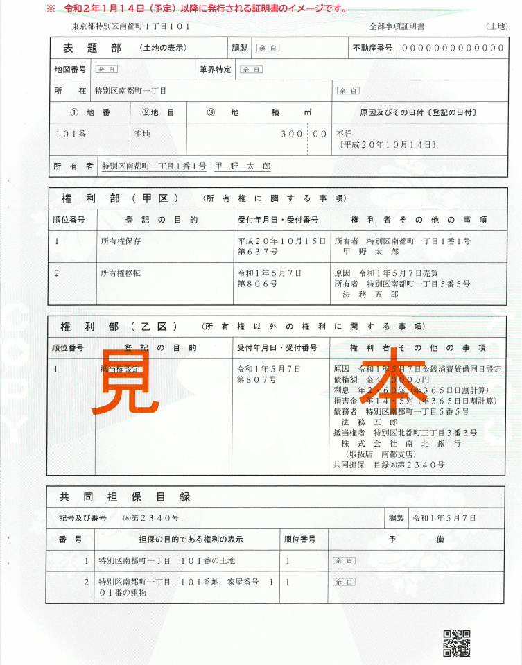 なお、この記事で登記簿は誰もが閲覧できるとご紹介しましたが、法務省が公開する、登記簿を写した書面である登記事項証明書の見本は以下のとおりです。